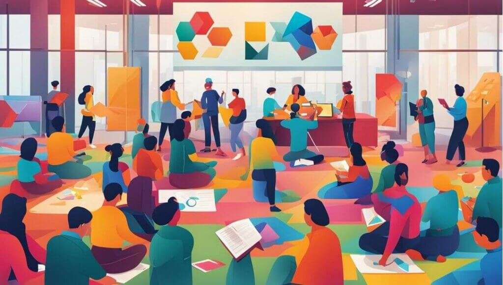 Create an image of a group of people actively engaged in hands-on learning activities, such as building or experimenting. Show the excitement and curiosity on their faces as they work together to discover new ideas and solutions. Use bright colors and bold lines to convey the dynamic energy of the experience.